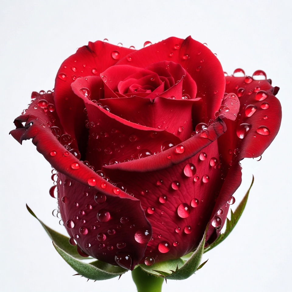 bloom, closeup, dew drops, floral, flower, fresh, green leaves, isolated, macro, nature, petals, rose, stem, vibrant, water droplets, wet petals, white background, red rose