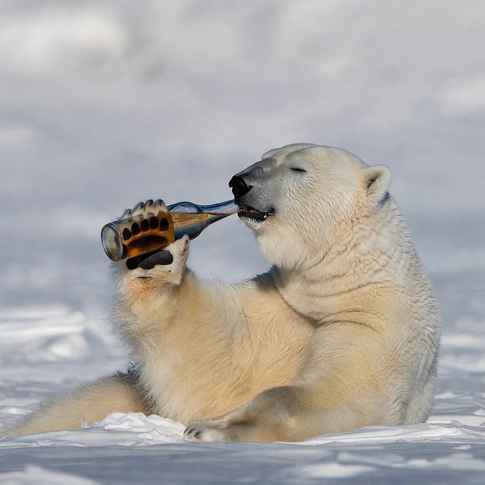 animal, arctic, bear, black claws, bottle, brown bottle, cold, drinking, glass bottle, isolated background, sitting bear, snow, snowy ground, white fur, wildlife, polar bear