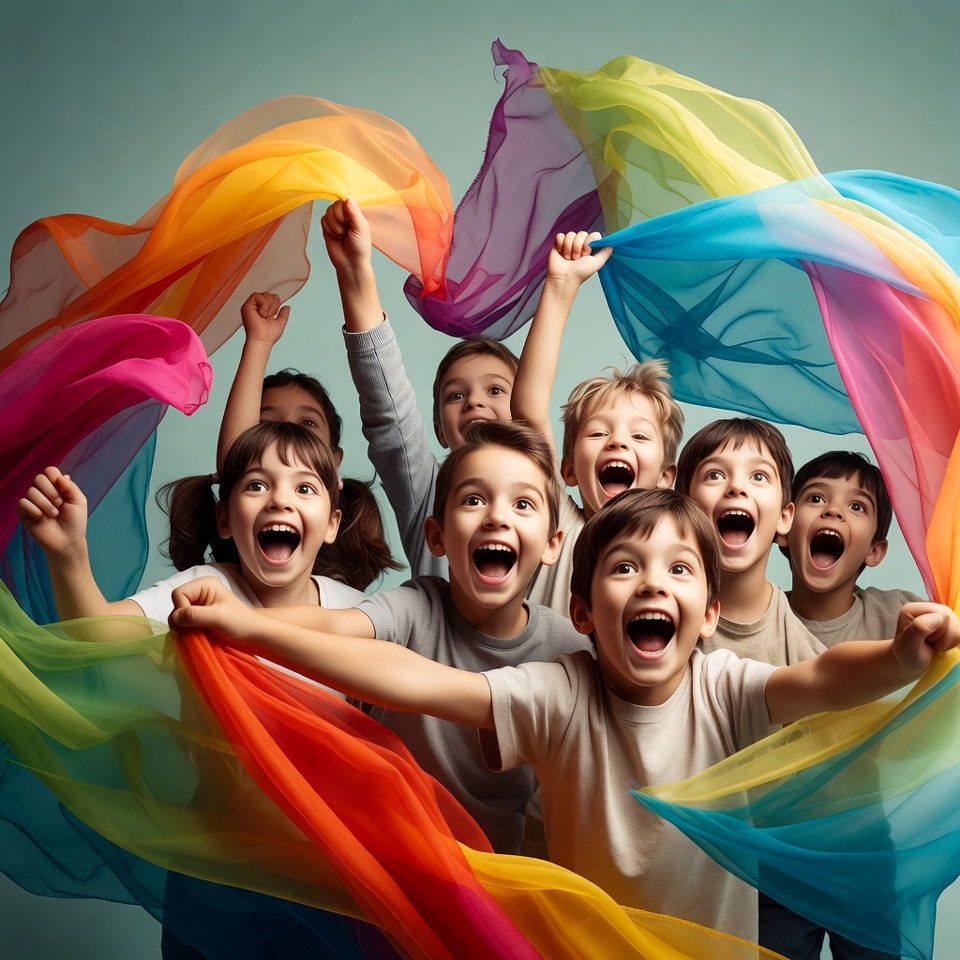 boys, clipart style, colorful scarves, diverse kids, excited children, girls, gray shirts, group children, heart shape, holding scarves, illustration, joyful group, kids, play activity, rainbow fabric, raised arms, smiling kids, teal background, vibrant colors, young boys, young girls, children