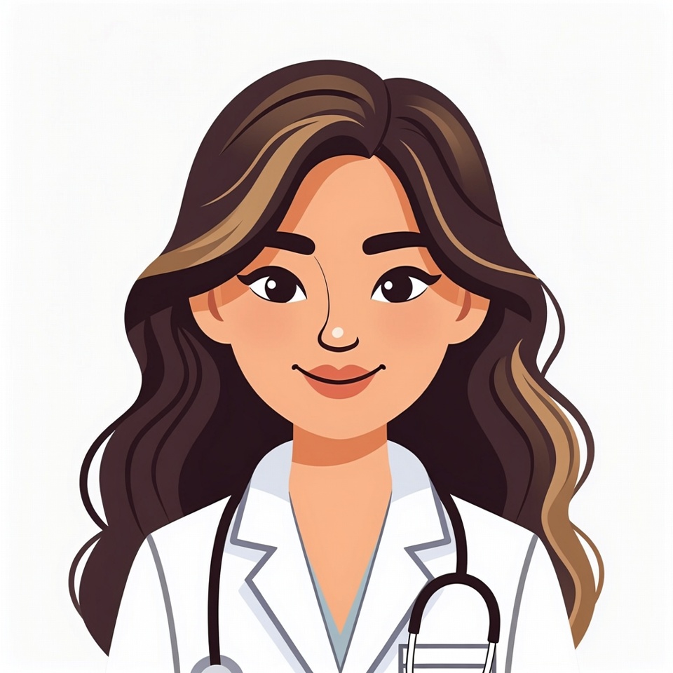 A smiling Asian woman with long wavy brown hair wears a white lab coat and stethoscope around her neck. She has a friendly expression with large eyes and is depicted in a colorful cartoon style. The illustration features her on a plain isolated background.