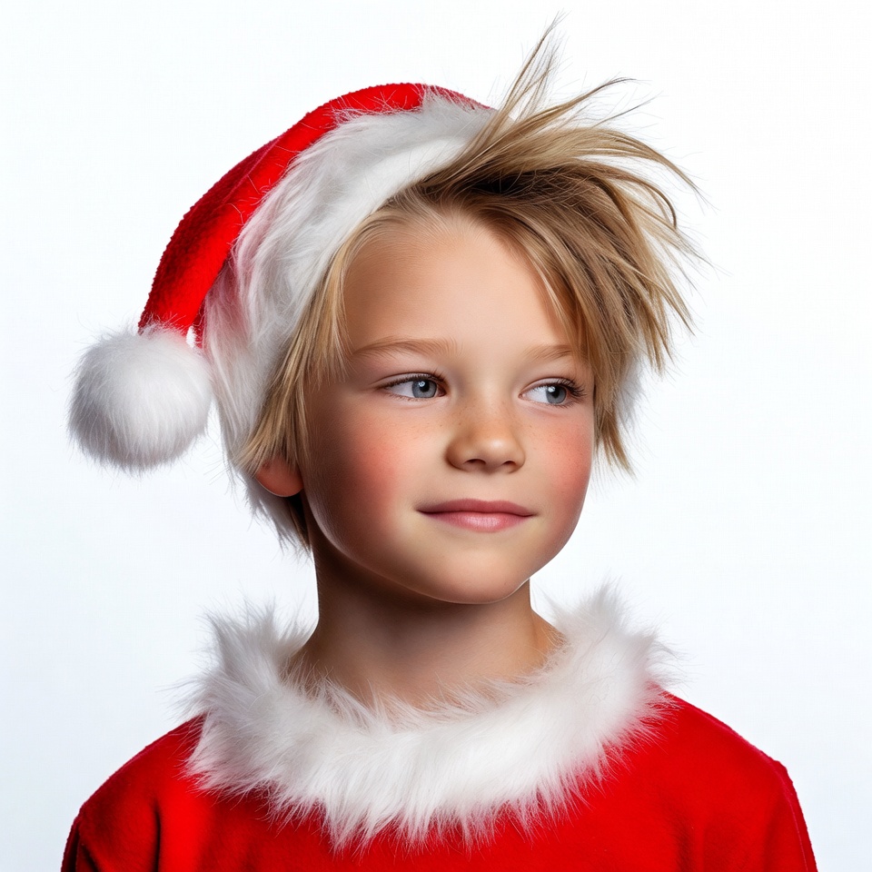 Christmas, Santa hat, Santa suit, White, blonde hair, blue eyes, child, festive, holiday, isolated background, red outfit, smiling boy, spiky hair, white fur, young boy, boy