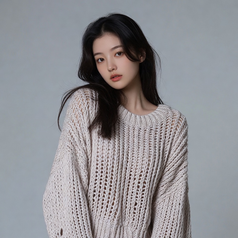 A young Asian woman with long black hair stands against a plain gray background. She wears a loose-fitting, light-colored knit sweater with an open weave design and gazes softly at the camera. Her hair falls over one shoulder, framing her face.