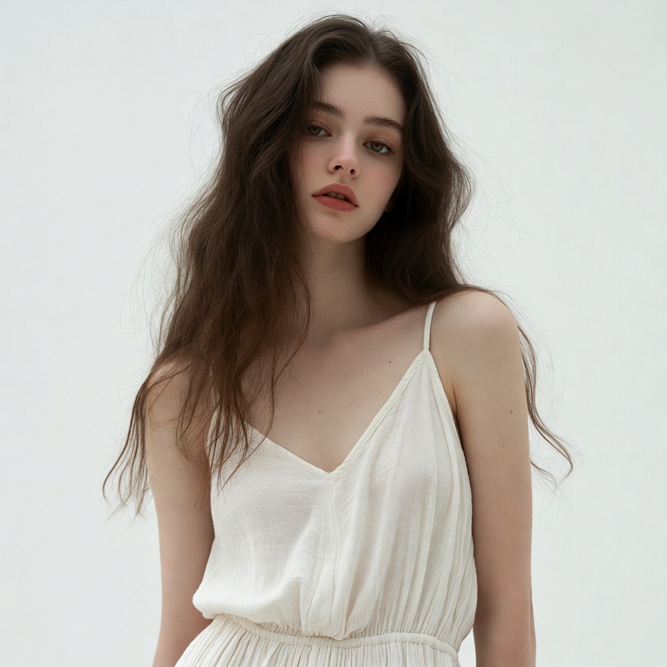 A young woman with long wavy brown hair stands against a plain white background. She wears a sleeveless white spaghetti strap slip dress with a V-neckline. Her expression is soft with subtle makeup and direct gaze at the camera.