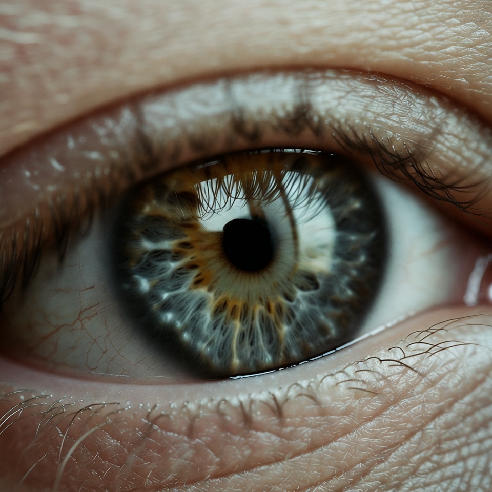 A detailed close-up of a human eye with striking hazel coloration featuring green and brown hues around the pupil. Long eyelashes frame the eye, and subtle reflections appear in the cornea. Fine wrinkles are visible on the surrounding eyelid skin.