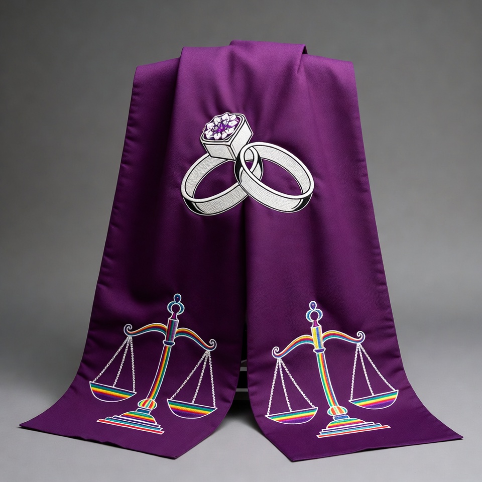 clipart, diamond ring, equality symbol, gold scales, illustration, isolated background, justice symbol, legal marriage, marriage symbol, purple fabric, rainbow scales, scales of justice, symbolic design, wedding rings, white rings, purple sash