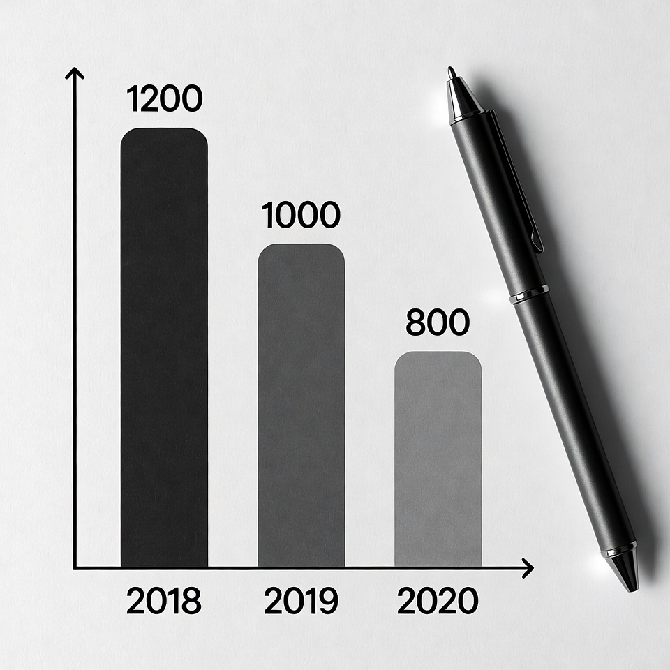 A bar chart on a white background shows sales or data declining from 1200 in 2018 to 1000 in 2019 and 800 in 2020. The bars are in black, dark gray, and light gray respectively, with labeled axes. A black pen lies diagonally beside the chart.