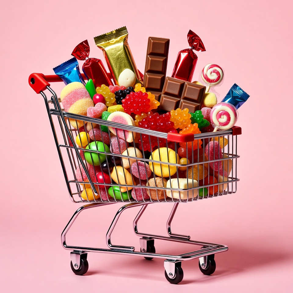 assortment, candy, candy cart, chocolate, colorful candy, confections, dessert, food, full cart, gummies, isolated background, jelly sweets, licorice, lollipops, no people, pink background, red handle, sugar, supermarket cart, sweets, treats, vibrant colors, wrapped candy, shopping cart