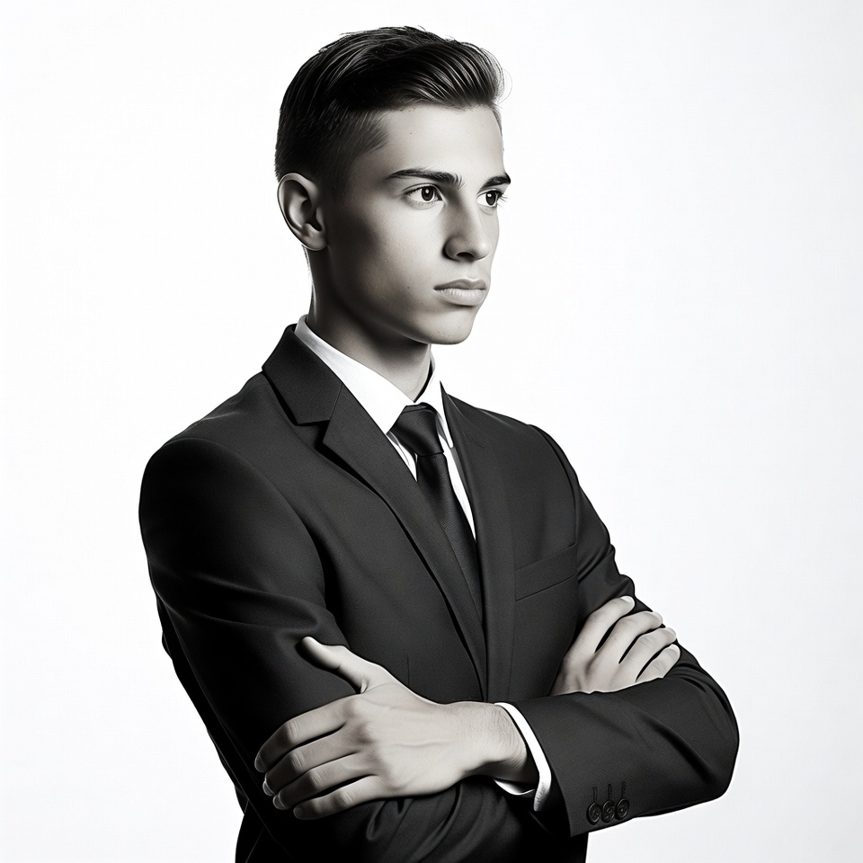 A young man with short dark hair stands in profile view against a white background. He wears a black suit, white dress shirt, and black tie, with arms crossed confidently. His expression is neutral and gaze directed sideways.