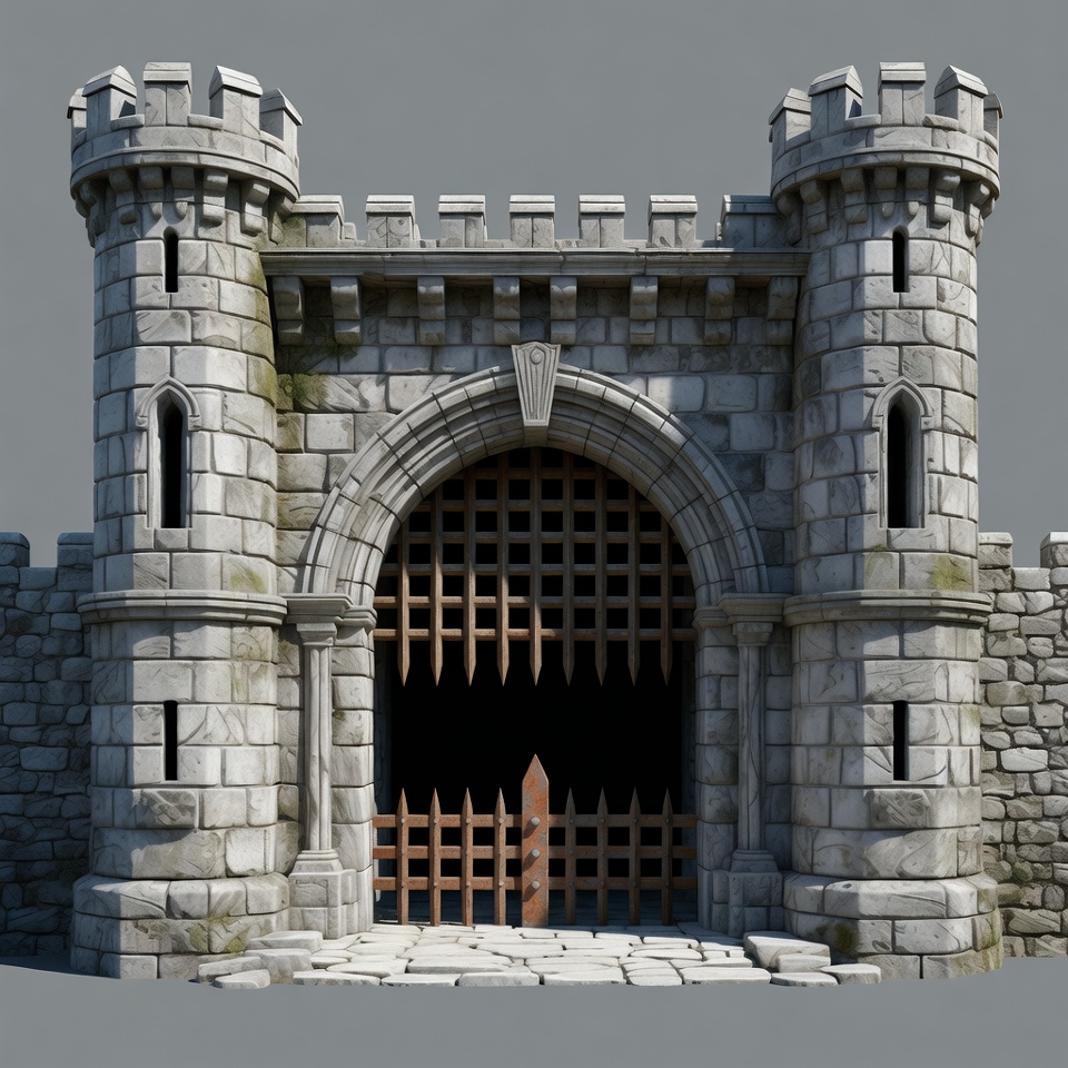 3D render, architecture, archway, battlements, fortress, gate, gray background, illustration, isolated background, medieval, moss, portcullis, stone, towers, walls, wooden gate, castle