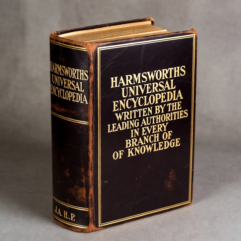 Harmsworths, antique encyclopedia, authorities, book cover, gold lettering, isolated background, knowledge, leather bound, old book, reference book, universal encyclopedia, vintage book, encyclopedia