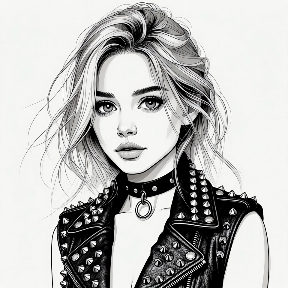 White, beautiful woman, black and white, blonde hair, choker necklace, confident expression, detailed illustration, drawing, edgy fashion, fashion portrait, female, illustration, leather vest, portrait, punk style, ring pendant, sexy woman, spiked jacket, studs, wavy hair, young woman, woman