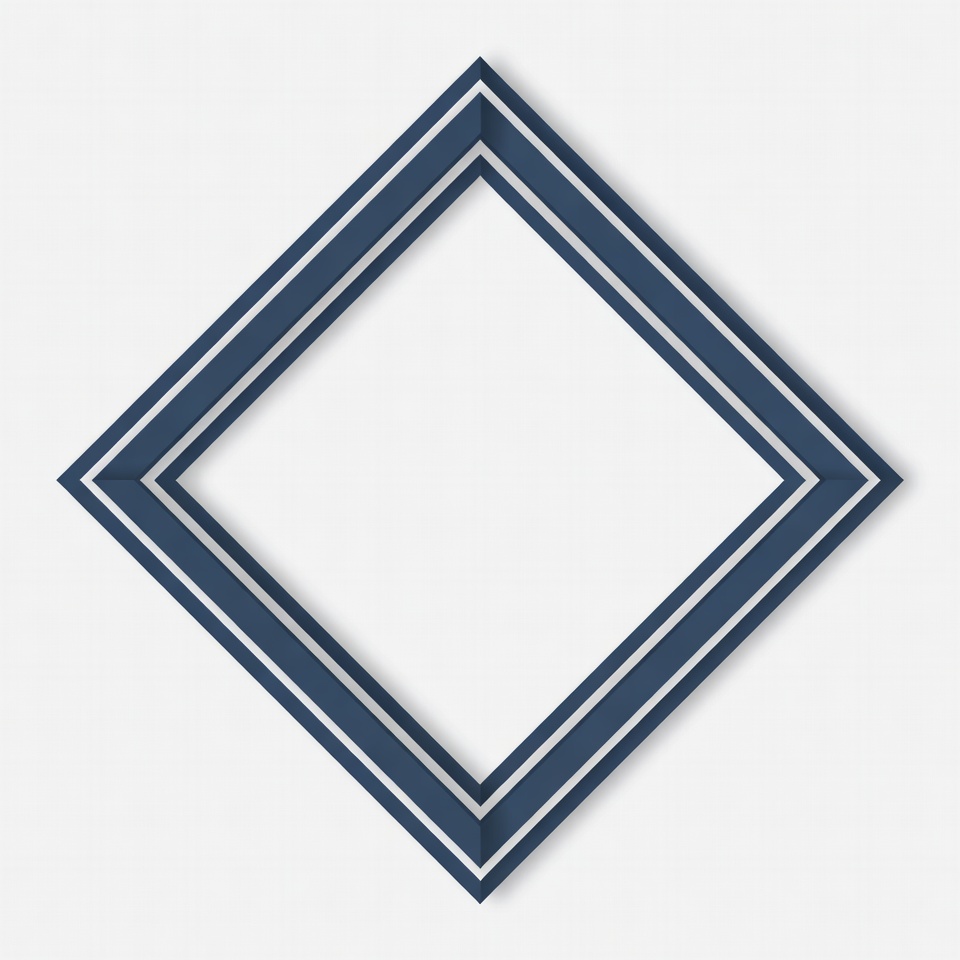A navy blue diamond-shaped picture frame with multiple layered borders is centered on a white background. The frame features thick, angled navy borders creating a 3D effect. The interior is completely empty and white.