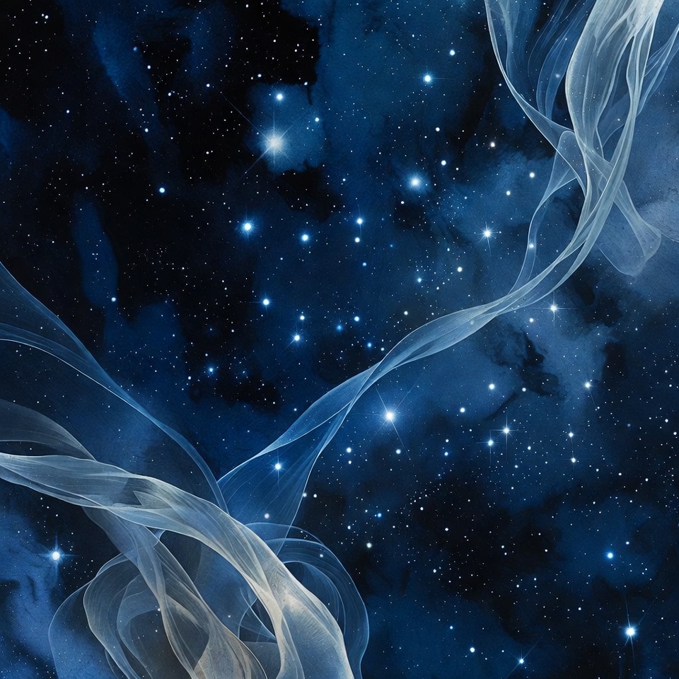 A cosmic scene features a deep blue nebula filled with bright twinkling stars. Ethereal white veils swirl gracefully through the starry expanse. The image captures a dreamy, abstract view of space with flowing translucent elements.