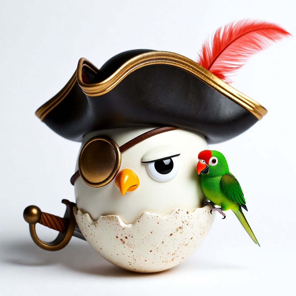 A cute white chick dressed as a pirate hatches from a speckled egg. It wears a black tricorn hat with gold trim, an eyepatch, and holds a sword. A green parrot with a red feather perches on its shoulder.