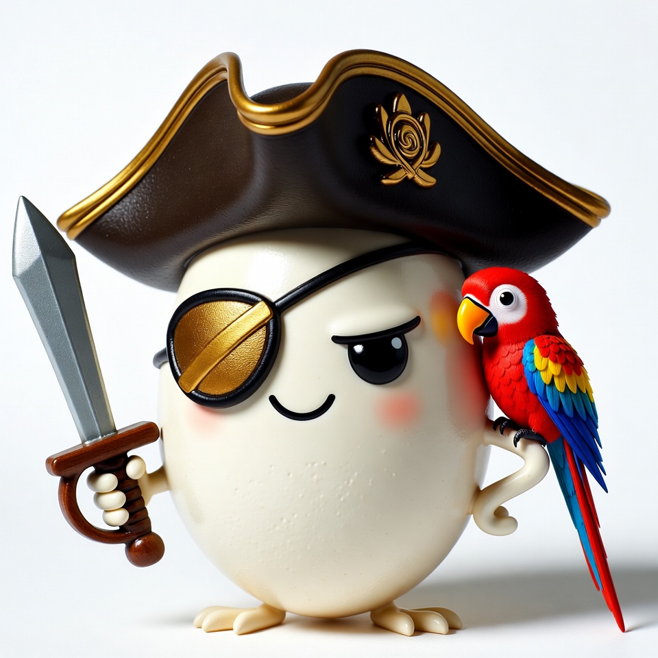 A cute white egg character dressed as a pirate wears a large black tricorn hat with gold accents and a golden eyepatch over one eye. A vibrant red and green parrot perches on its shoulder while the egg holds a silver sword in its hand. The figure stands on an isolated white background.