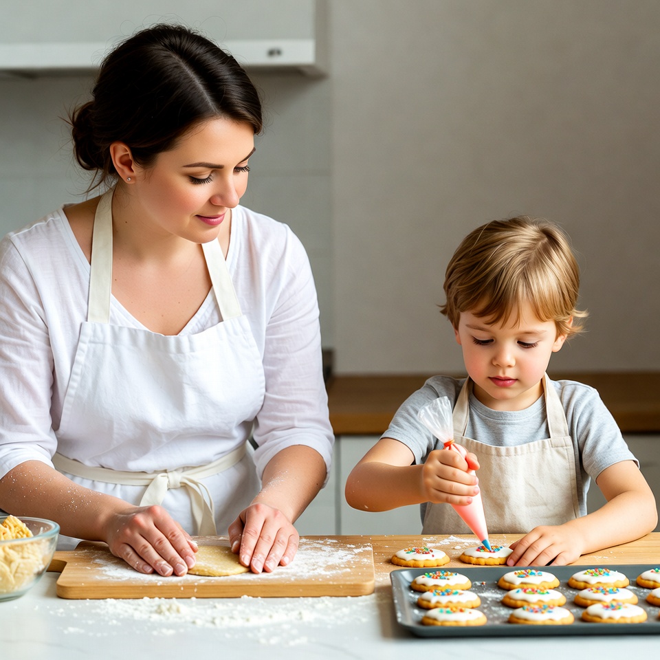 A woman with dark hair wearing a white apron stands at a kitchen counter, piping icing onto cookies. A young blond boy in a gray apron next to her holds a piping bag, adding sprinkles to cookies on a wooden board. A baking tray with decorated cookies sits in front of them on the white countertop.