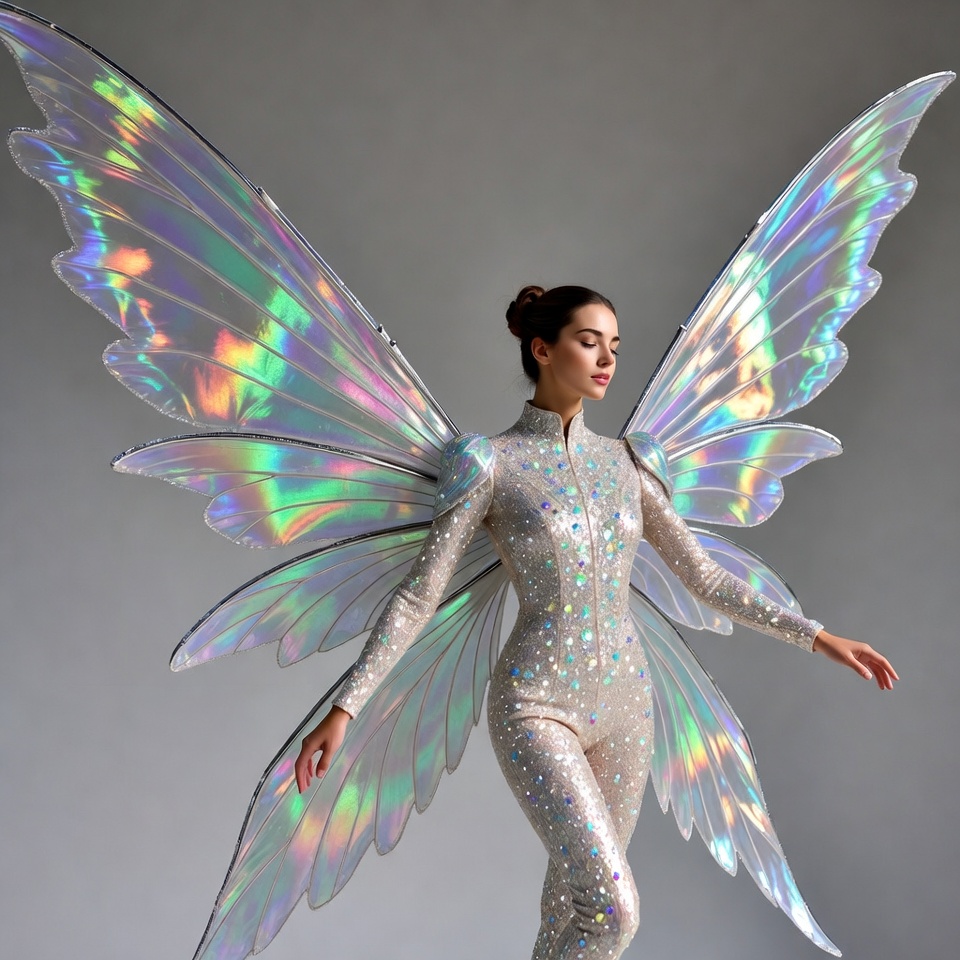 A woman with a bun hairstyle stands wearing a shiny silver bodysuit and large iridescent fairy wings on a gray background. The wings feature holographic rainbow reflections and extend prominently from her back. She poses gracefully with one hand extended.
