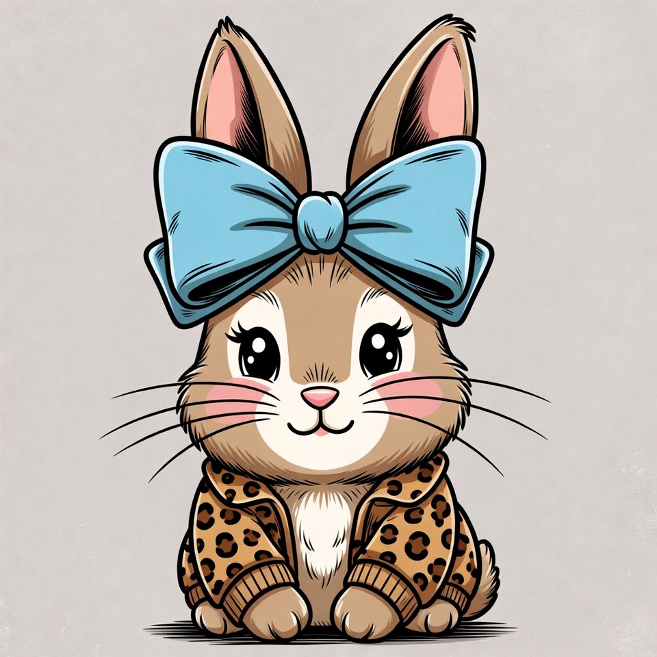 An adorable cartoon bunny sits with large expressive eyes and fluffy fur. It wears a large blue bow on its head and a stylish leopard print jacket. The illustration features a simple gray background.