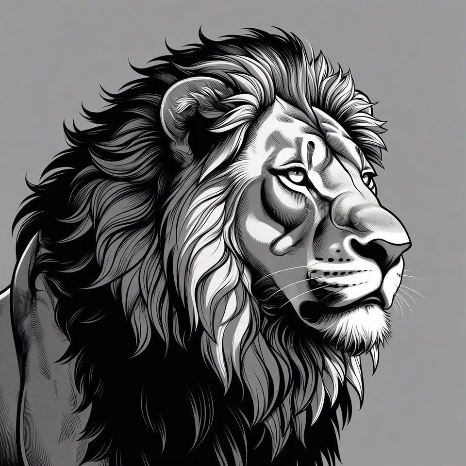 animal illustration, black and white, detailed mane, fierce lion, illustration, ink drawing, isolated background, king of jungle, line art, lion head, lion portrait, mane, predatory eyes, profile view, roaring lion, wild animal, lion