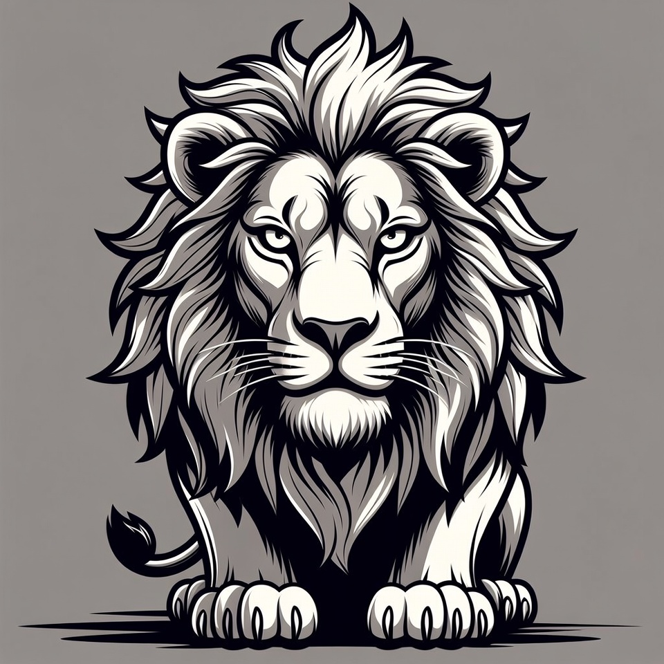A detailed black and white illustration of a majestic lion with a large flowing mane stares intensely forward. The lion sits on its haunches with paws extended, set against a gray background. Bold line art emphasizes the fierce expression and muscular build.