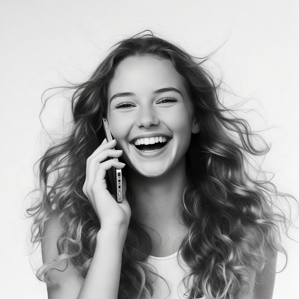 A young woman with long wavy hair holds a smartphone to her ear and laughs joyfully. Her face shows wide smile and crinkled eyes in a close-up portrait. She wears a simple top against a white background in black and white.