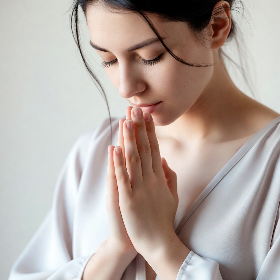 A young woman with long dark hair tied back presses her palms together in a prayer gesture. She wears a white flowing top and gazes downward serenely against a plain white background. Her eyes are softly closed, emphasizing the calm pose.
