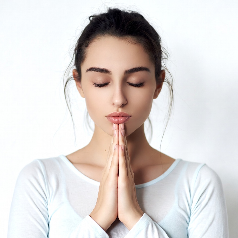 A young woman with dark hair tied in a bun stands against a white background, eyes closed in serenity. She wears a light blue off-shoulder top and holds her hands together in a prayer gesture near her chest. Her expression is calm with soft lips slightly pursed.