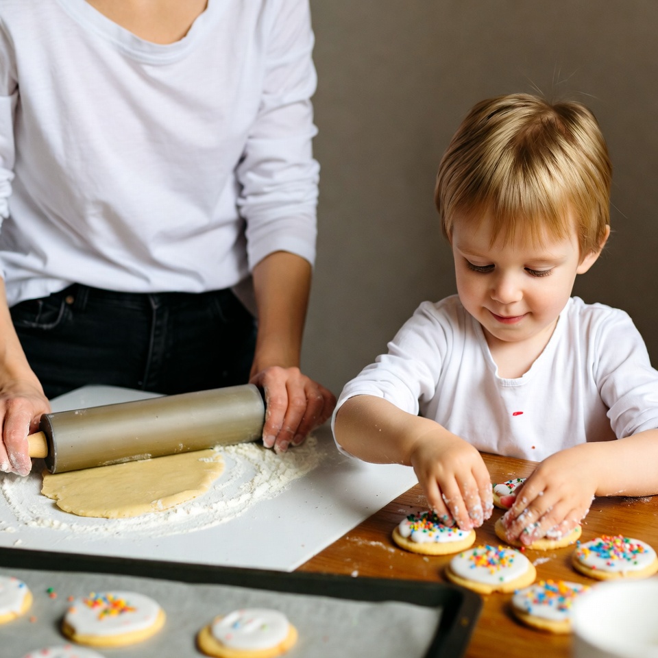 A White mother in a white top and jeans rolls out cookie dough with a rolling pin while her young White boy in a white shirt sprinkles colorful toppings on cookies. They work together at a wooden table covered in flour and dough. Nearby, a baking sheet holds finished cookies decorated with sprinkles.