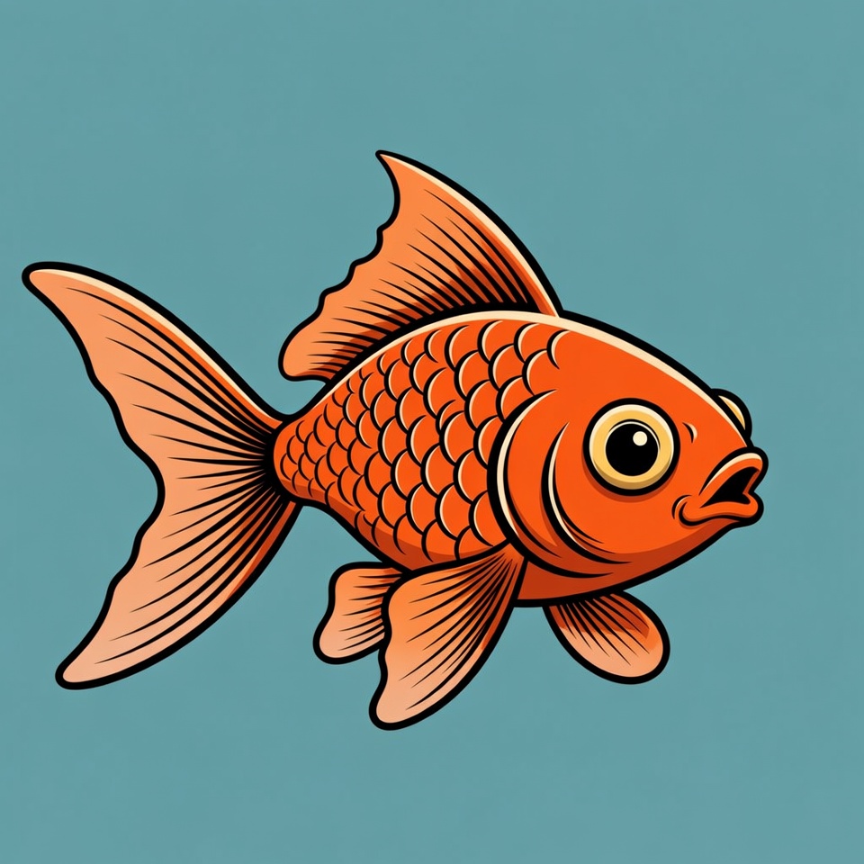 A vibrant orange goldfish with large expressive eyes swims against a solid teal background. Its fins and scales are detailed in a bold cartoon style. The fish faces slightly to the right with an open mouth.