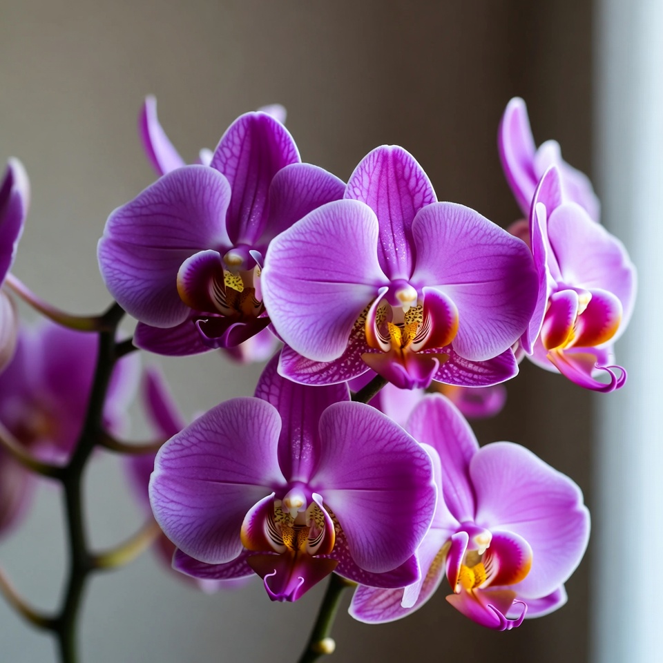 Phalaenopsis orchids, blooming orchids, botany, close-up flowers, exotic flowers, floral, flower bouquet, flower cluster, flowers, green stems, indoor plant, nature, orchid blooms, petal details, purple flowers, purple orchids, veined petals, vibrant purple, yellow centers, orchid