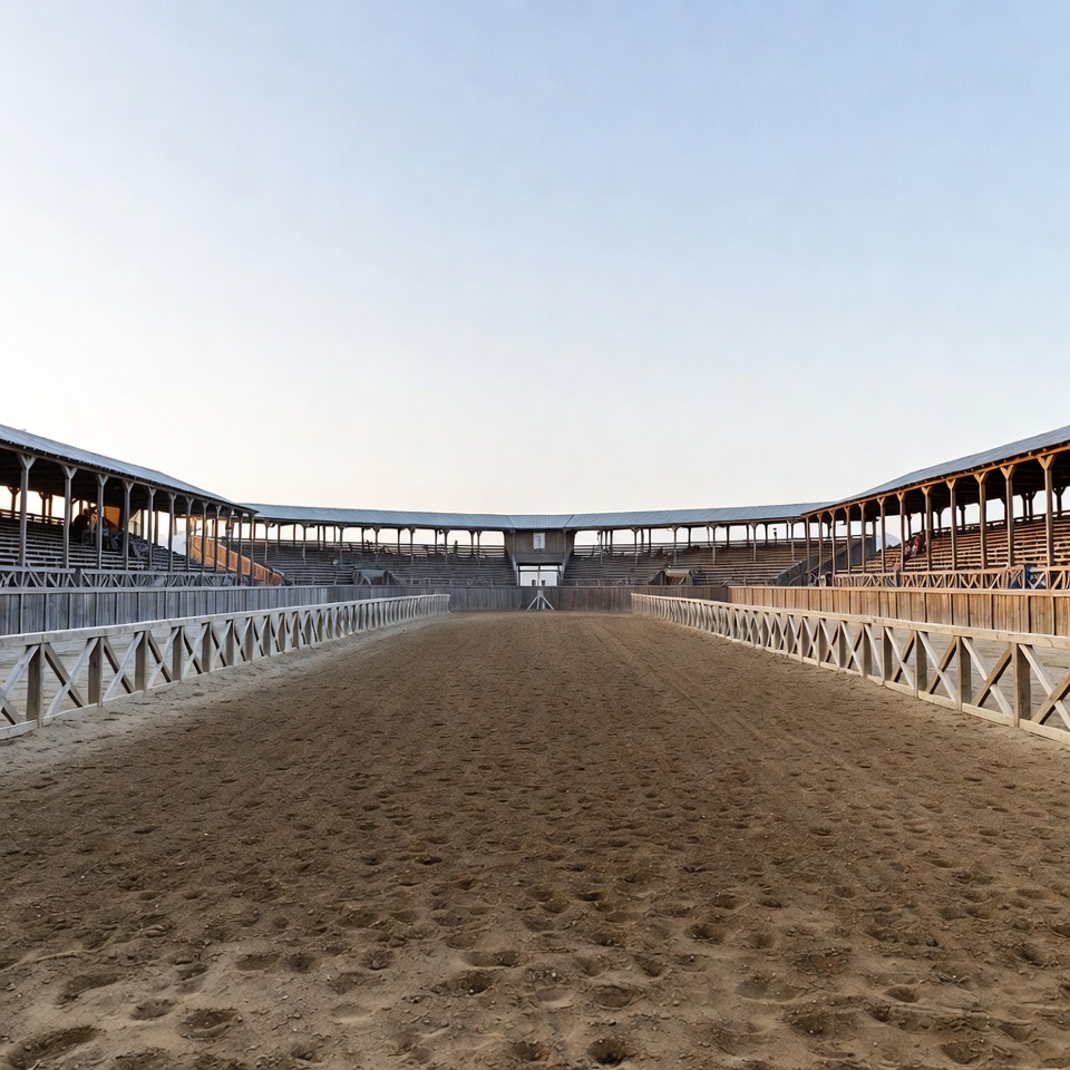 bleachers, blue sky, dirt track, empty arena, equestrian, grandstands, isolated background, metal roof, outdoor stadium, racetrack, rodeo arena, stadium, vacant, wooden fences, wooden structure, horse arena