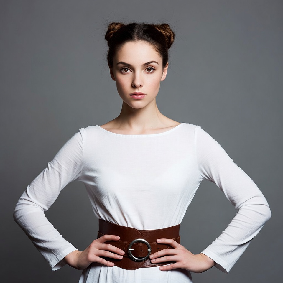A young woman with dark hair styled in two buns stands confidently against a gray background. She wears a long-sleeved white top and a wide brown leather belt with a large buckle around her waist. Her hands rest on the belt as she gazes directly at the camera.