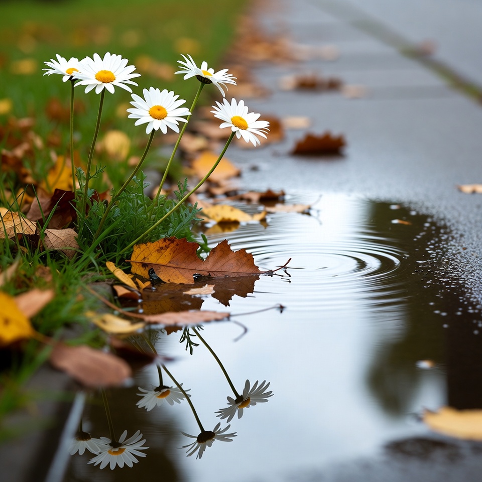 autumn leaves, fall foliage, flowers, green grass, isolated background, macro, nature, orange leaves, outdoors, pavement, plants, puddles, rain, reflections, sidewalk, water, wet road, white flowers, yellow centers, daisies