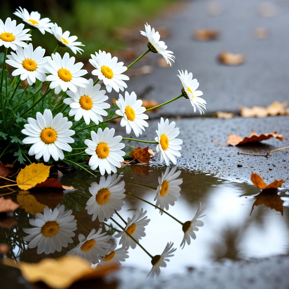 A cluster of white daisies with yellow centers grows beside a wet pavement path. Fallen autumn leaves in yellow and orange hues scatter around the flowers. The daisies and leaves are beautifully reflected in a large puddle on the ground.