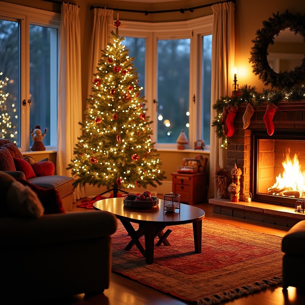 A warmly lit living room features a decorated Christmas tree with colorful lights and ornaments next to a brick fireplace with a roaring fire. Red stockings hang above the mantel, and garlands adorn the space, with large windows showing a snowy outdoor view. A coffee table holds a bowl of ornaments, surrounded by plush sofas and a red rug.
