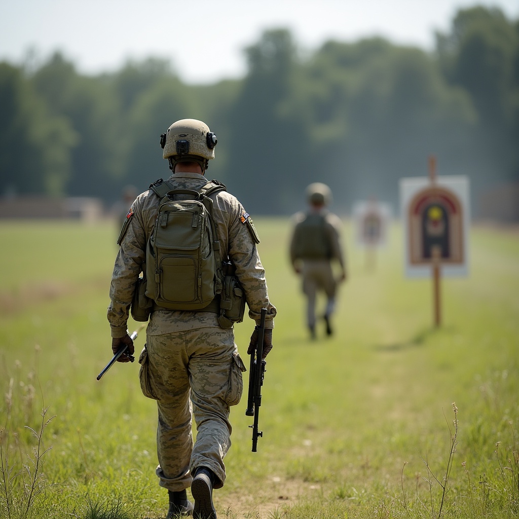 Several soldiers in camouflage uniforms and helmets walk along a grassy path toward white archery targets on wooden stands. The lead soldier carries a rifle and baton, with a backpack, while others follow in the background. A forested area and hazy sky frame the outdoor training scene.