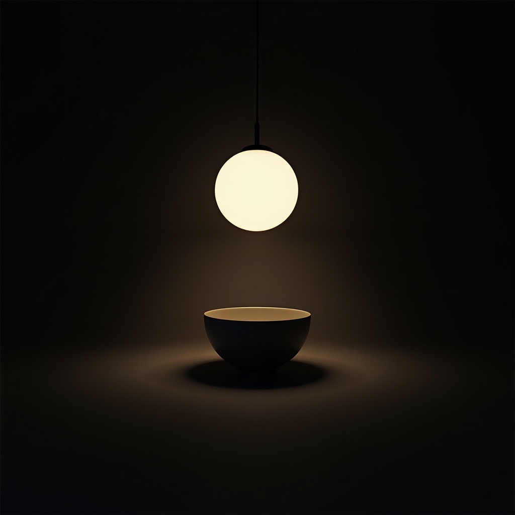 ceramic bowl, dark background, glow, hanging light, isolated, light fixture, lighting, minimalist, modern, object, pendant light, round light, shadows, simple, single bowl, still life, studio lighting, white bowl, white light, bowl