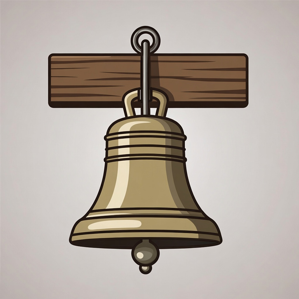 A golden brass bell hangs from a wooden beam by a chain. The bell features detailed ridges and a clapper at the bottom. It is illustrated on a light gray isolated background.
