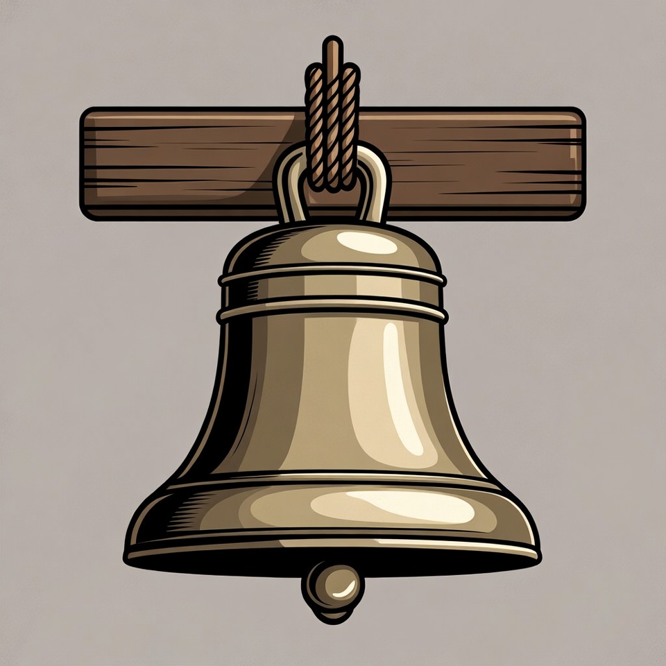 A golden bell hangs from thick ropes attached to a wooden beam. The illustration features a detailed brass bell with a clapper and smooth contours. It is set against a plain gray background.