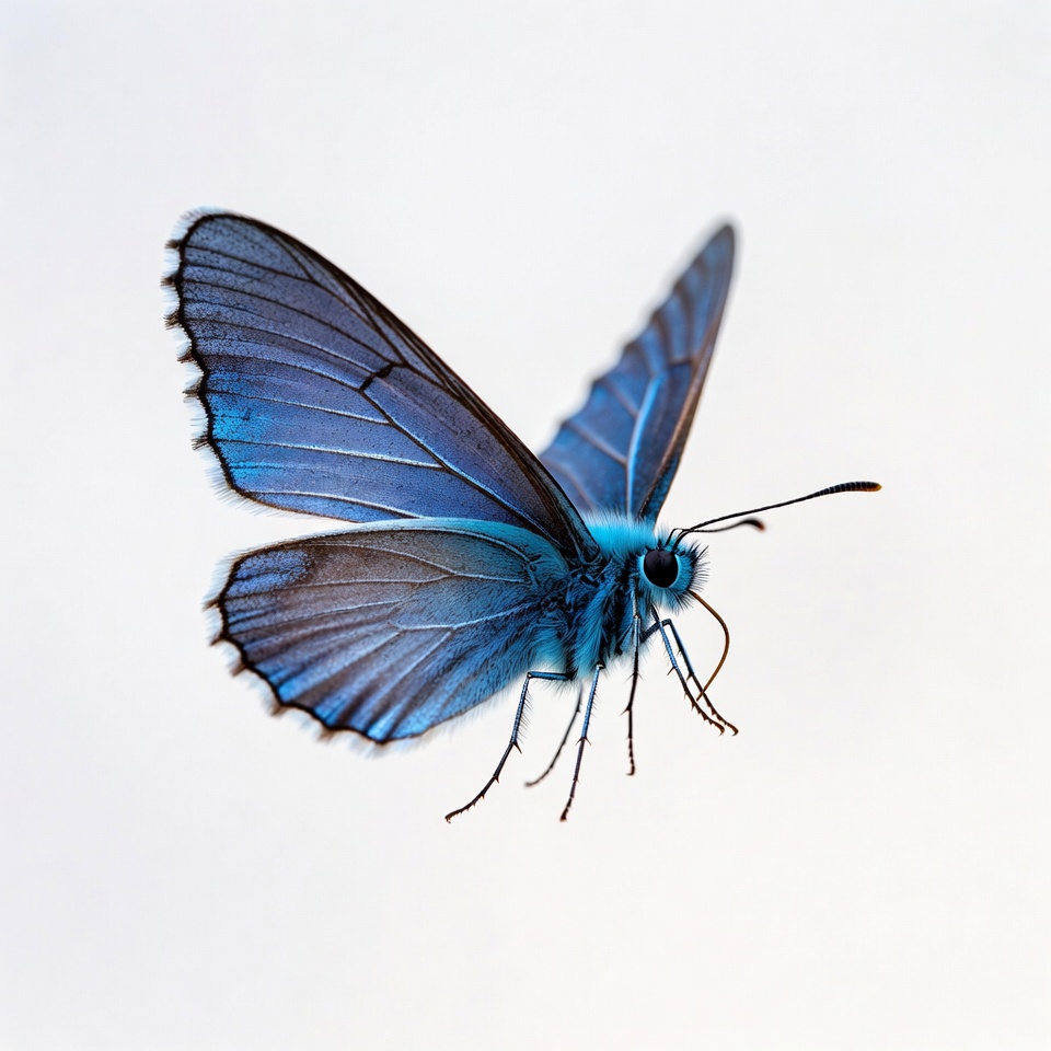 antennae, butterfly, flying, insect, isolated, legs, macro, nature, purple edges, vibrant blue, white background, wildlife, wings, blue butterfly