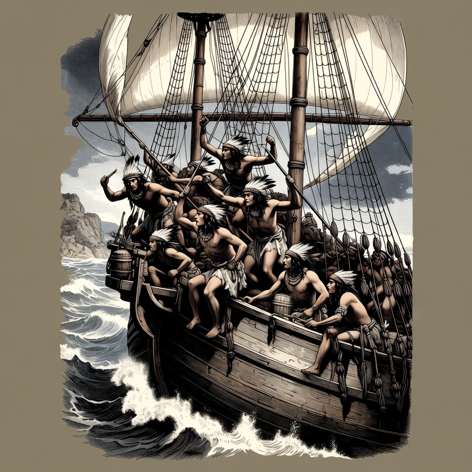 An illustration depicts numerous Native American warriors with feathers in their hair, clad in traditional loincloths, aboard a large wooden sailing ship with billowing white sails. They wield spears and paddles while the ship navigates turbulent ocean waves near rocky cliffs under a cloudy sky. The sepia-toned artwork captures dynamic action on the wooden deck crowded with barrels.