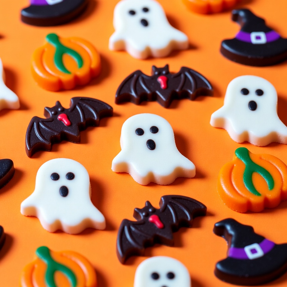 An arrangement of small Halloween-themed candy shapes scattered across an orange background. The candies include white ghosts with black eyes, black bats with red mouths, orange pumpkins with green stems, and black witch hats. They are depicted in a playful, illustrative style with vibrant colors.
