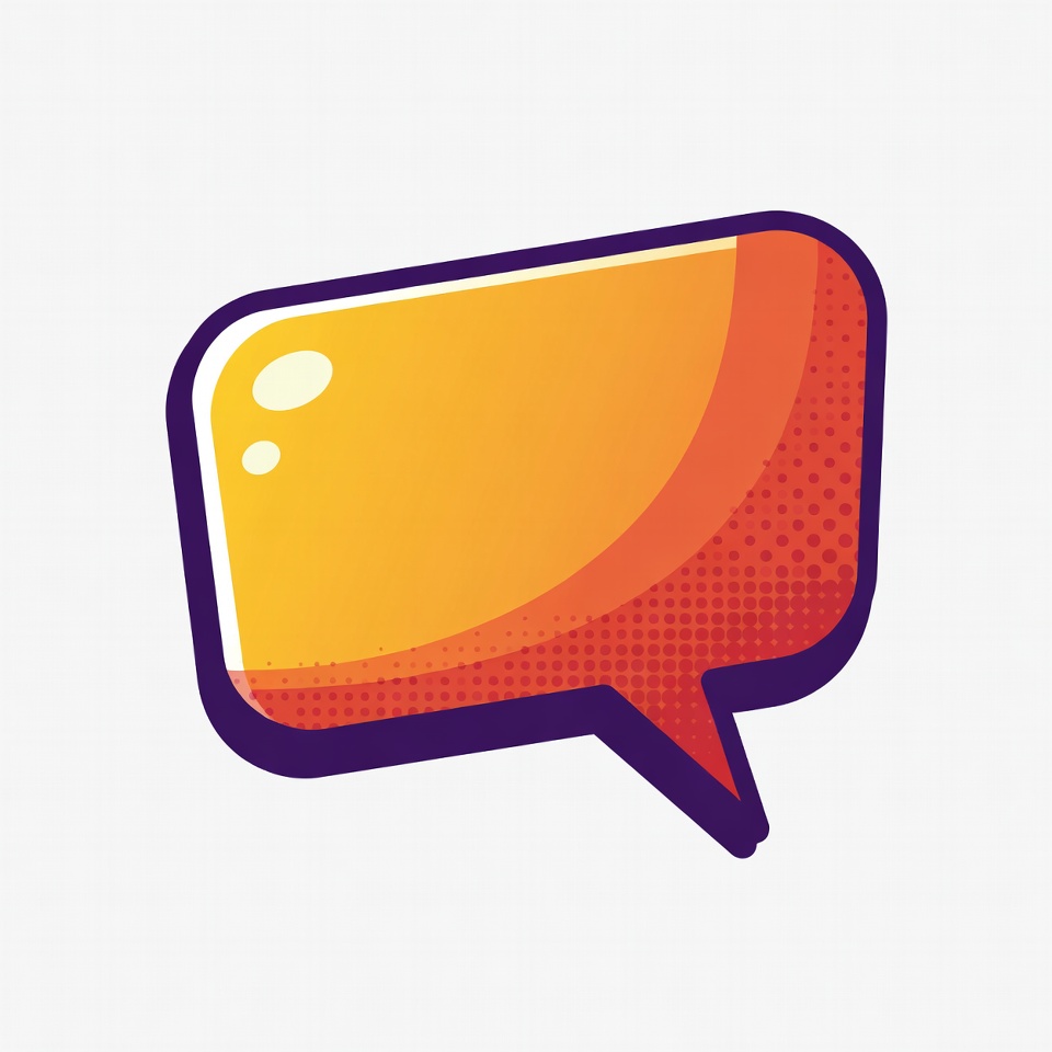 A vibrant yellow speech bubble with glossy highlights and red gradient edges. It features a comic-style dotted texture and a pointed tail on the right side. The bubble is outlined in bold purple on a transparent background.