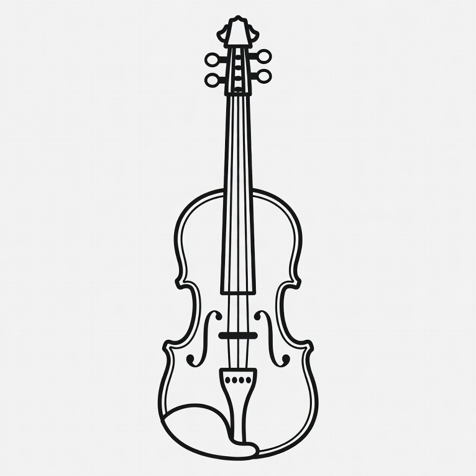 A simple black line drawing of a violin is shown on a white background. The violin features detailed outlines of the body, neck, scroll, strings, and f-holes. It stands vertically in a classic pose.