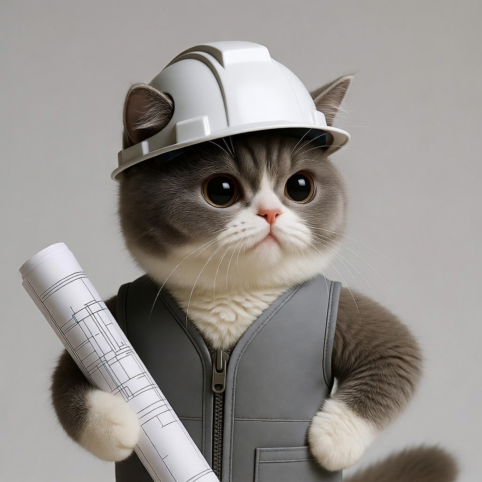 A cute grey Scottish Fold cat wears a white hard hat and grey vest while holding rolled blueprints. The cat stands confidently with big round eyes and paws gripping the documents. It poses against a plain white background.