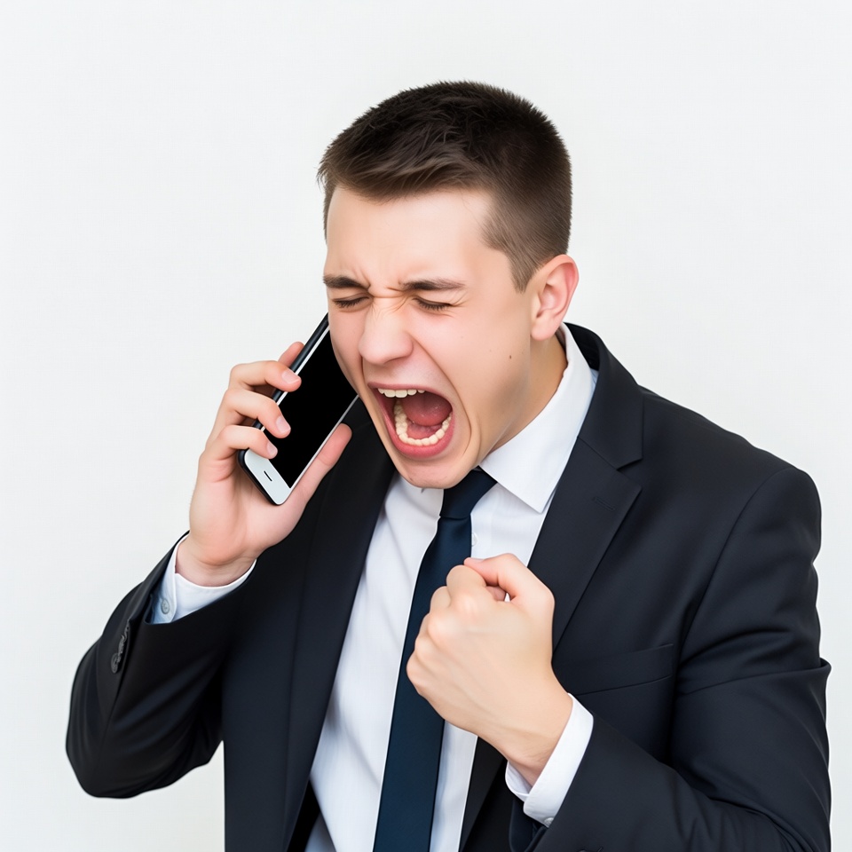 A young man with short dark hair is yelling into a black smartphone held to his ear. He wears a dark suit, white shirt, and blue tie, with his mouth wide open and eyes squinted in intensity. His other hand is clenched into a fist raised near his chest, all against a plain white background.