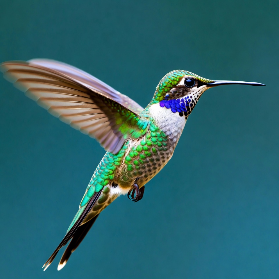 avian, beak, bird, bird flight, blue background, blue crown, feathers, flying hummingbird, green hummingbird, iridescent feathers, isolated background, nature, white throat, wildlife, wings spread, hummingbird