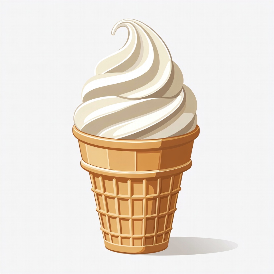 A cartoon illustration of a vanilla soft serve ice cream in a waffle cone. The ice cream features tall, swirled white scoops on top of a brown textured cone. It is depicted on an isolated white background with a subtle drop shadow.