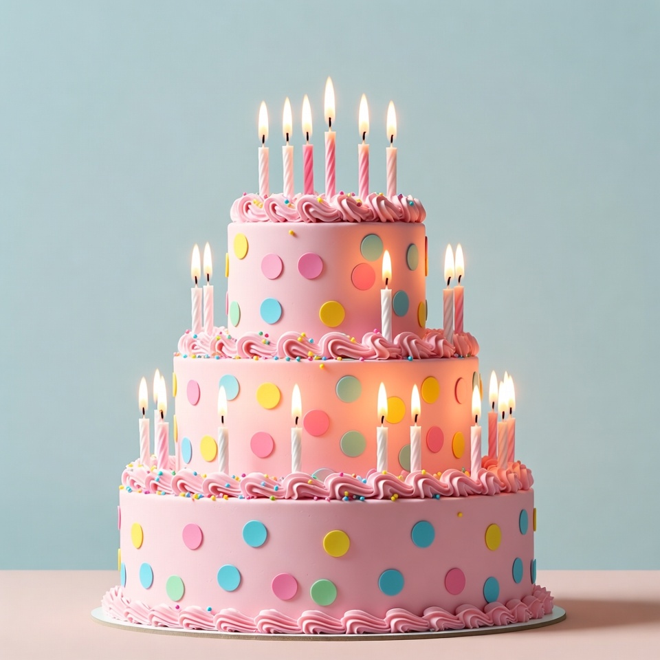 birthday candles, cake layers, cake on table, candles, celebration cake, colorful dots, frosting, isolated background, lit candles, multi-layer cake, party cake, pink cake, pink frosting, polka dots, three tier cake, birthday cake