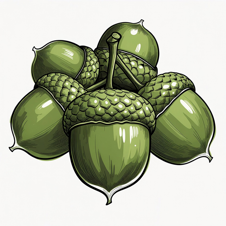 A detailed illustration features a cluster of green acorns with textured caps and stems. The acorns are arranged in a pile against a white background. Each acorn shows fine line art detailing on the scaly caps and smooth shells.